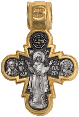 На нашем кресте по сторонам Богоматери в полукружиях изображены погрудные образы святых защитников Церкви: Николая Чудотворца и Георгия Победоносца.