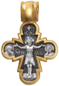 Маленький нательный крестик имеет форму, характерную для группы византийских энколпионов X–XII вв., где расширяющиеся от центра балки завершаются полукружием с уступами по краям. Пропорции креста близки к греческим, со слегка удлиненной нижней балкой. Оглавие неподвижное, бочкообразной формы. Иконографическая схема также традиционна для древних византийских крестов.