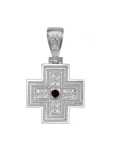 Крест родированный. Высота 32 мм с ушком, ширина 20 мм. Гранат. На лицевой стороне изображены пять крестов, соединённых в один символ, могут символизировать раны Христа, которые он получил во время Распятия. На оборотной стороне молитва Животворящему Кресту. Состав: Серебро 925