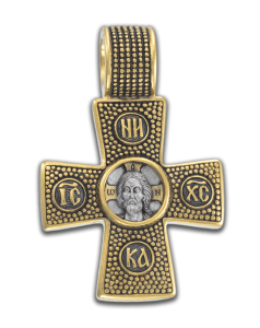 Небольшой нательный крестик развивает традицию группы византийских крестов 5-7 веков. Отличительными признаками этой группы являются близкие к греческим пропорции креста, слегка расширяющиеся балки, выделение центра с помощью круглого каста для вставки и использование зерни в качестве декора. Наш крест сохраняет традиционную форму. Все пространство его лицевой стороны, включая оглавие, покрыто зернью. В центре креста в круглом медальоне помещено рельефное изображение Нерукотворного образа Господа Бога и Спаса нашего Иисуса Христа. А в четырех медальонах на балках креста –Константинова надпись І&С Х&С НИКА (Иисус Христос – Победитель).