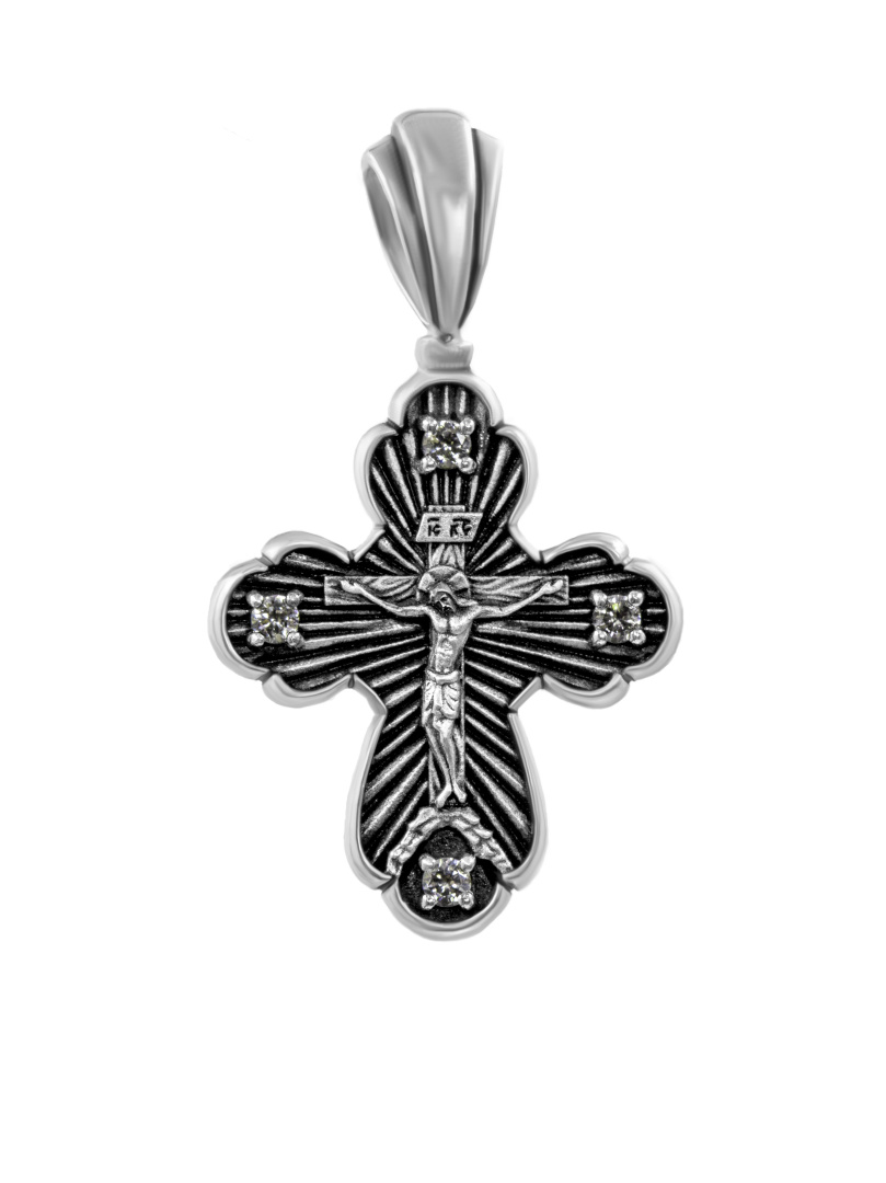 Подвеска представляет собой Крест. На лицевой стороне изображен крест с распятием Господа Иисуса Христа. Распятие символизирует победу над грехом и смертью. На оборотной стороне надпись ""Спаси и Сохрани"".