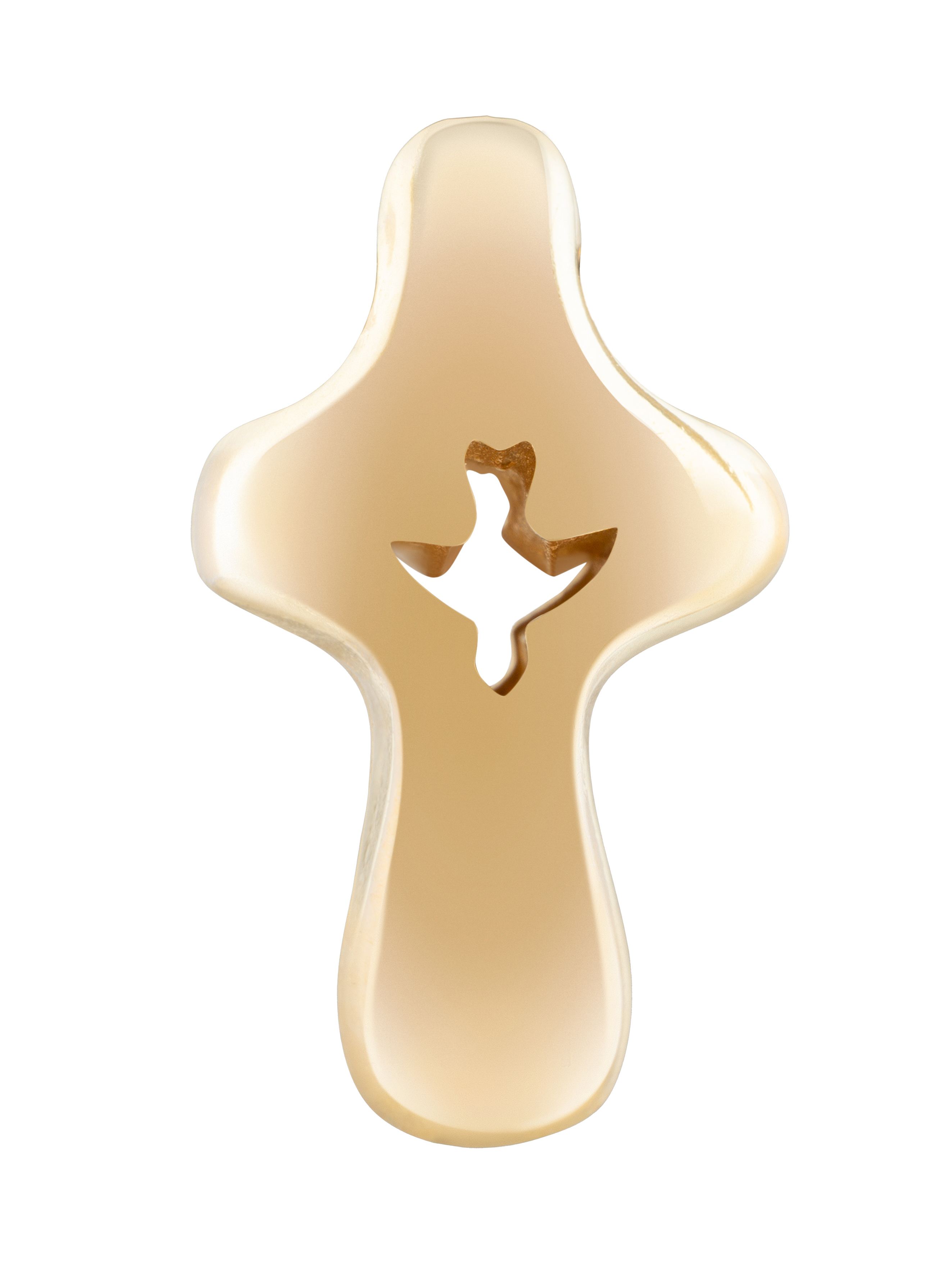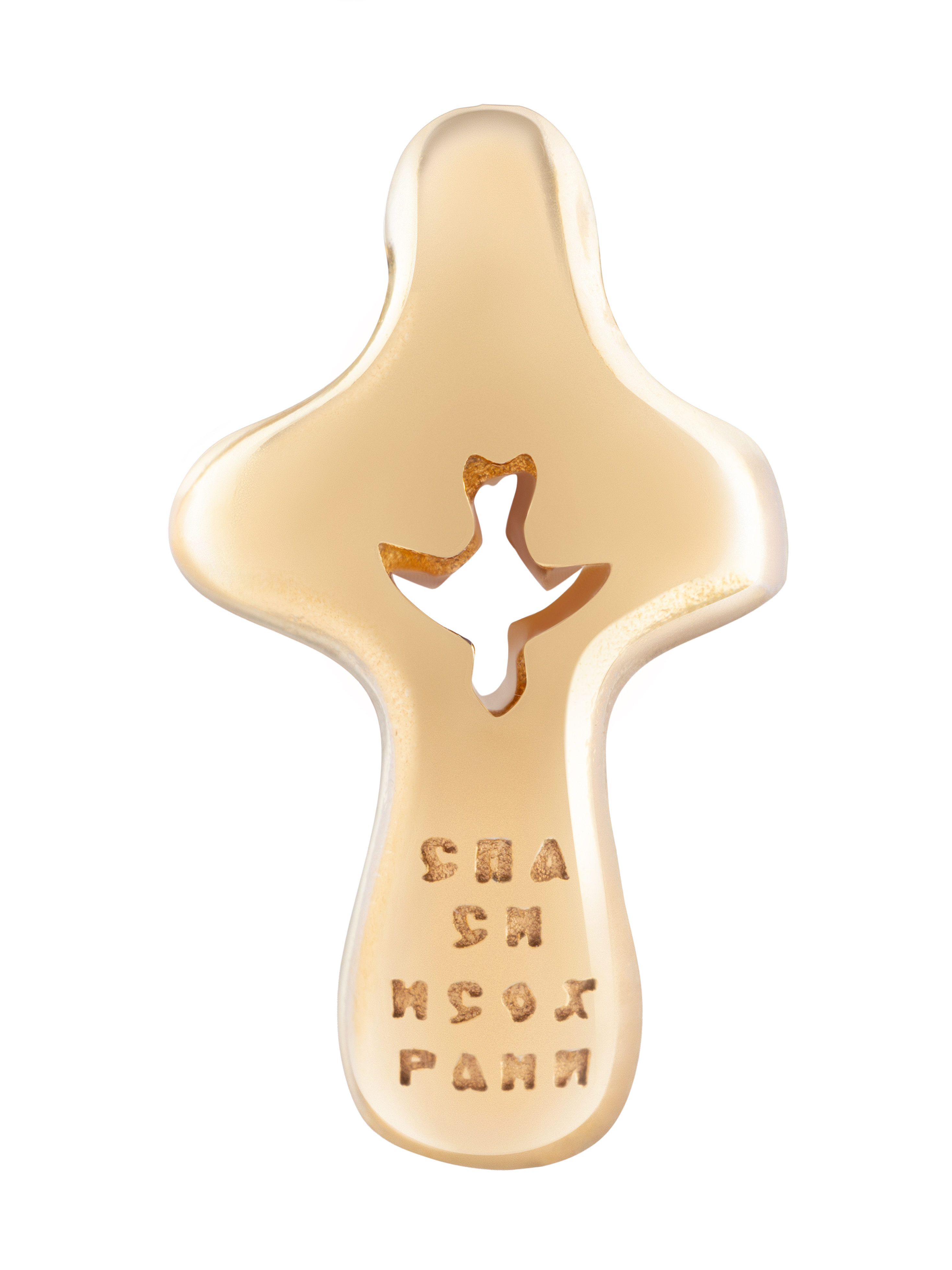 Подвеска представляет собой Крест младенческий с гайтаном, на лицевой стороне изображен Дух Святой в виде голубя. На оборотной стороне надпись "Спаси и Сохрани". Младе́нец – церковное наименование ребенка до семи лет. Соответствует канонам и изготовлено по благословению.
