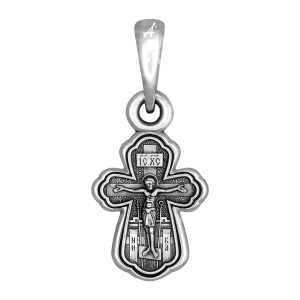 Маленький крест для младенца выполнен в русских традициях. Каждый из четырех концов перекладин заканчивается трилистником — символом Пресвятой Троицы. На лицевой стороне креста изображено Распятие. В православной традиции не принято изображать физические страдания Христа на Кресте: Распятие — торжественный, жизнеутверждающий образ спасения всего человечества. Поэтому Спаситель словно парит над миром на кресте, обнимая его распростертыми руками.