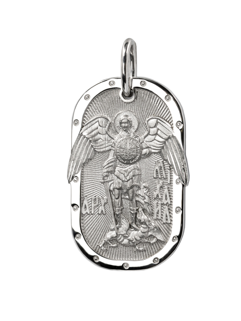 Медальон из серебра с изображением Архангела Михаила. На оборотной стороне- молитва Отче Наш. Размер: высота 37 мм с ушком, ширина 18 мм. Состав: Серебро 925 пробы с родированным покрытием