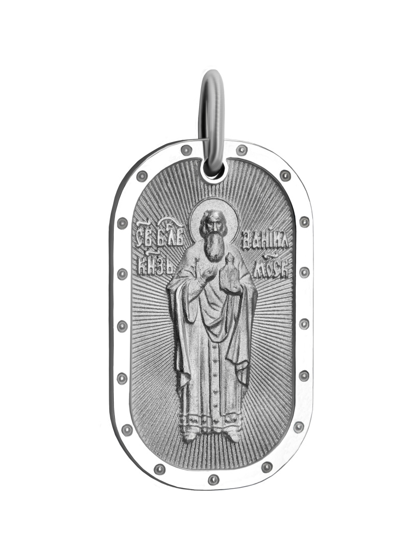 Медальон из серебра с изображением Пр. Даниила Московского. На оборотной стороне- молитва Отче Наш. Размер: высота 37 мм с ушком, ширина 18 мм. Состав: Серебро 925 пробы с родированным покрытием