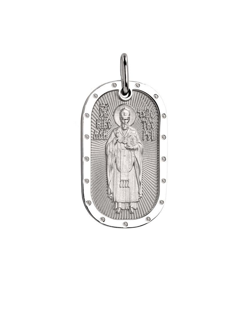 Медальон из серебра с изображением Николая Чудотворца. На оборотной стороне- молитва Отче Наш. Размер: высота 37 мм с ушком, ширина 18 мм. Состав: Серебро 925 пробы с родированным покрытием