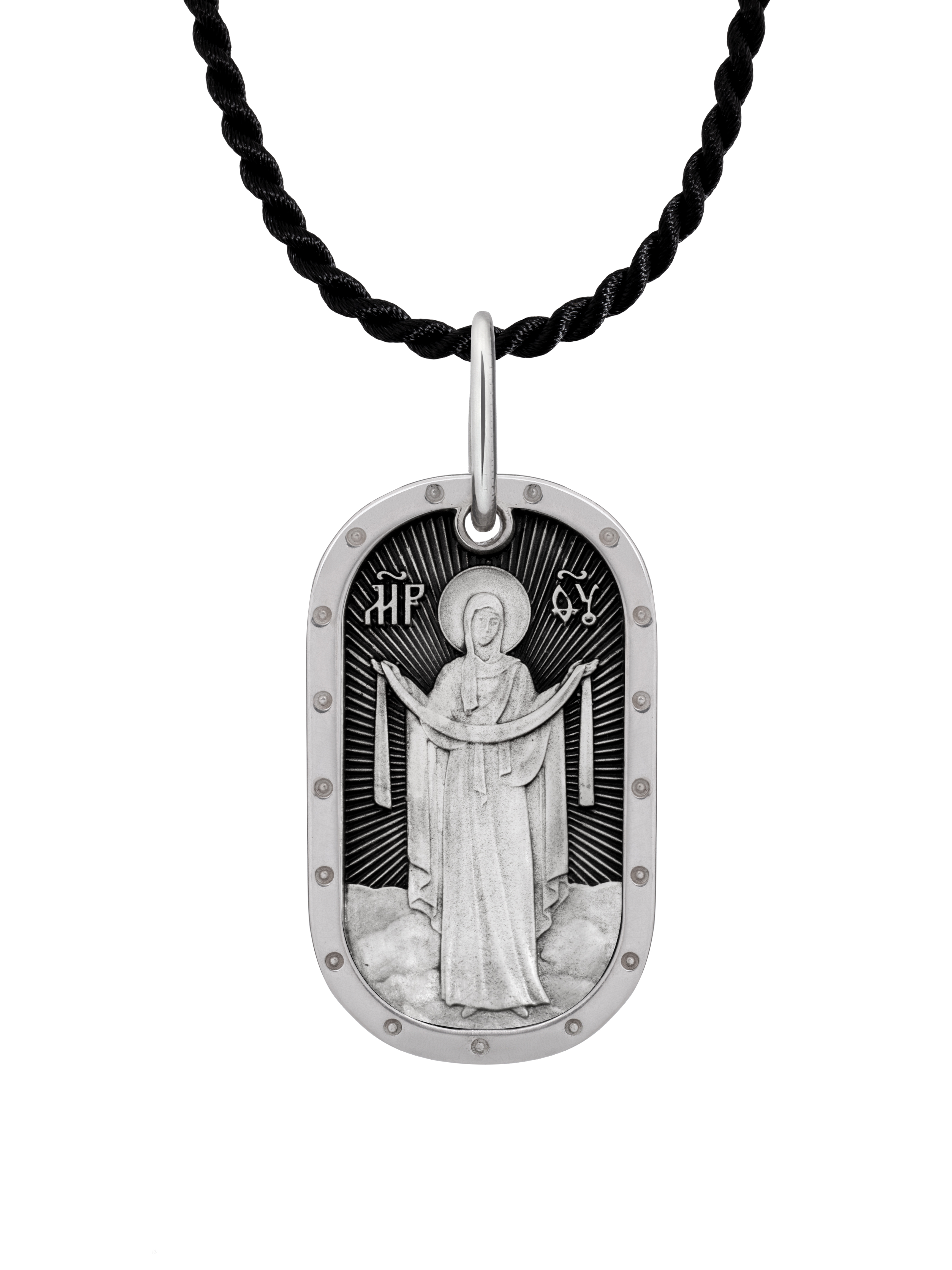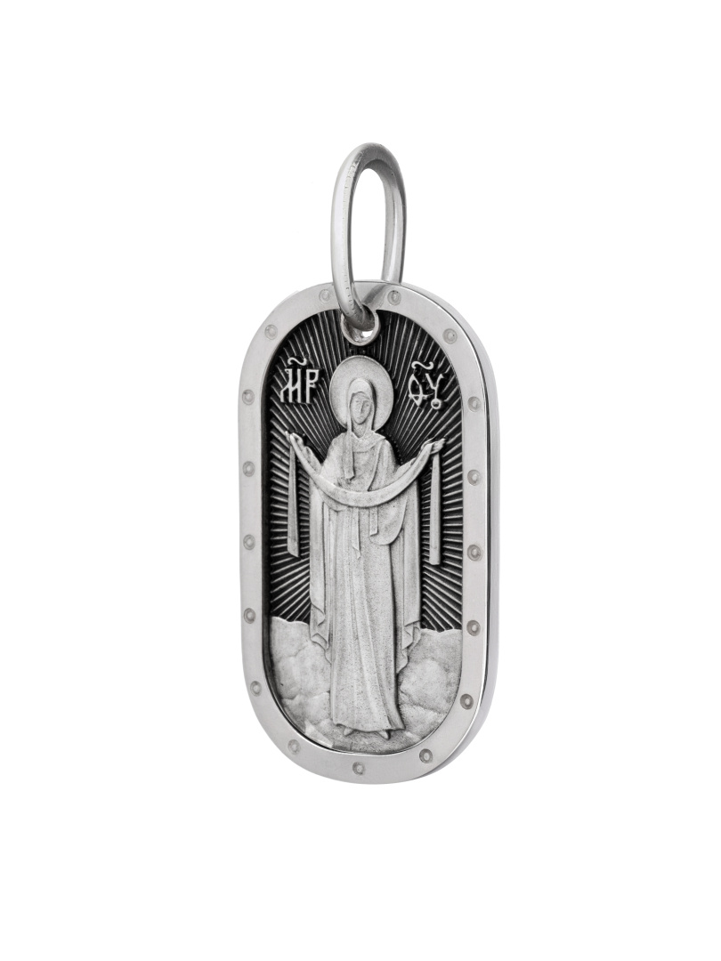 Подвеска-медальон с изображением иконы Покрова Божией Матери является воспоминанием чуда, которое произошло во Влахнернской церкви 1 (14) октября 910 года: Пресвятая Богородица явилась верующим над алтарем храма и распростерла над ними Свое покрывало. В этот день Божья Матерь открыла людям, что Она является Ходатаицей за них перед Богом. Все просьбы о защите, обращенные к Божьей Матери, будут услышаны, если исходят из глубины сердца. На обратной стороне ""молитва Богородице Дево радуйся"".