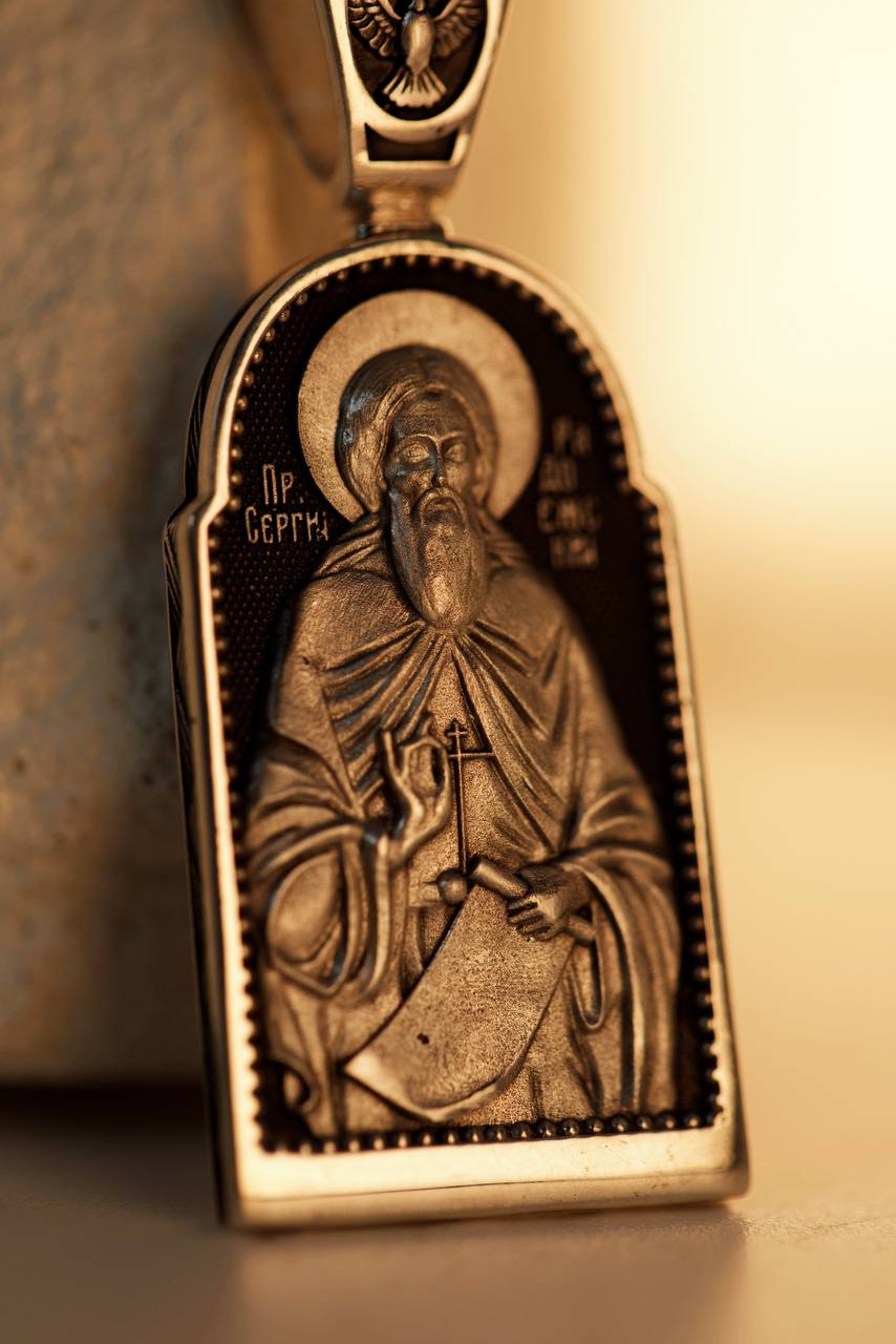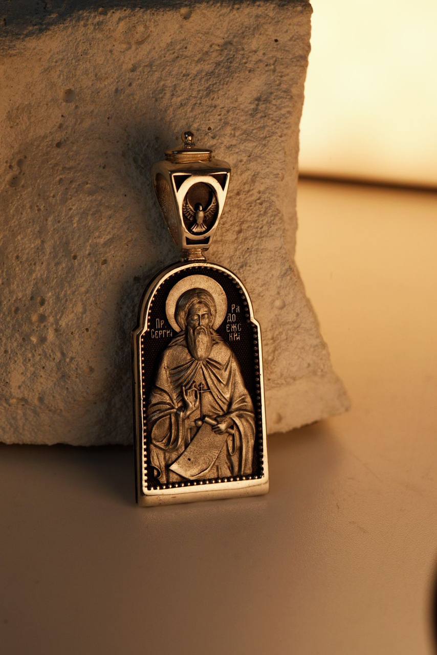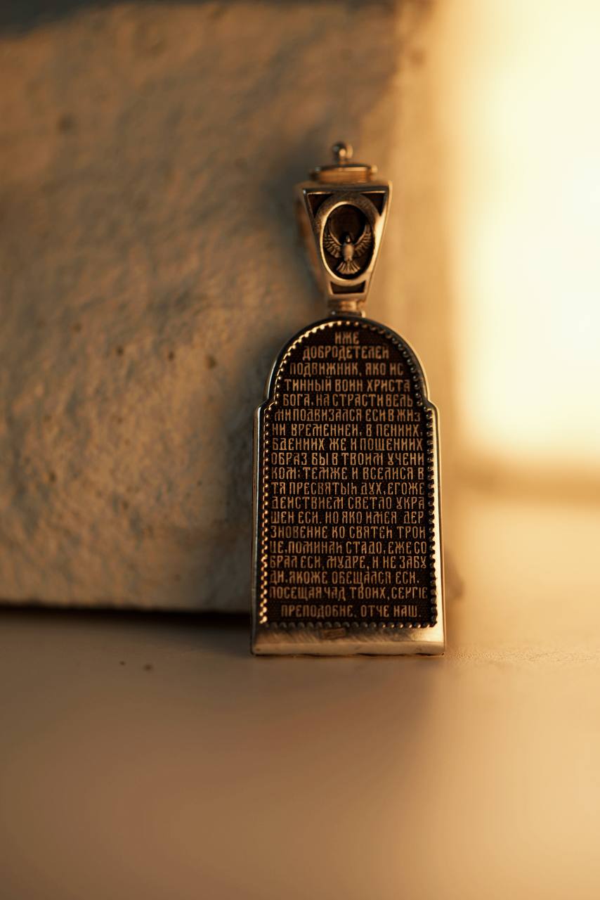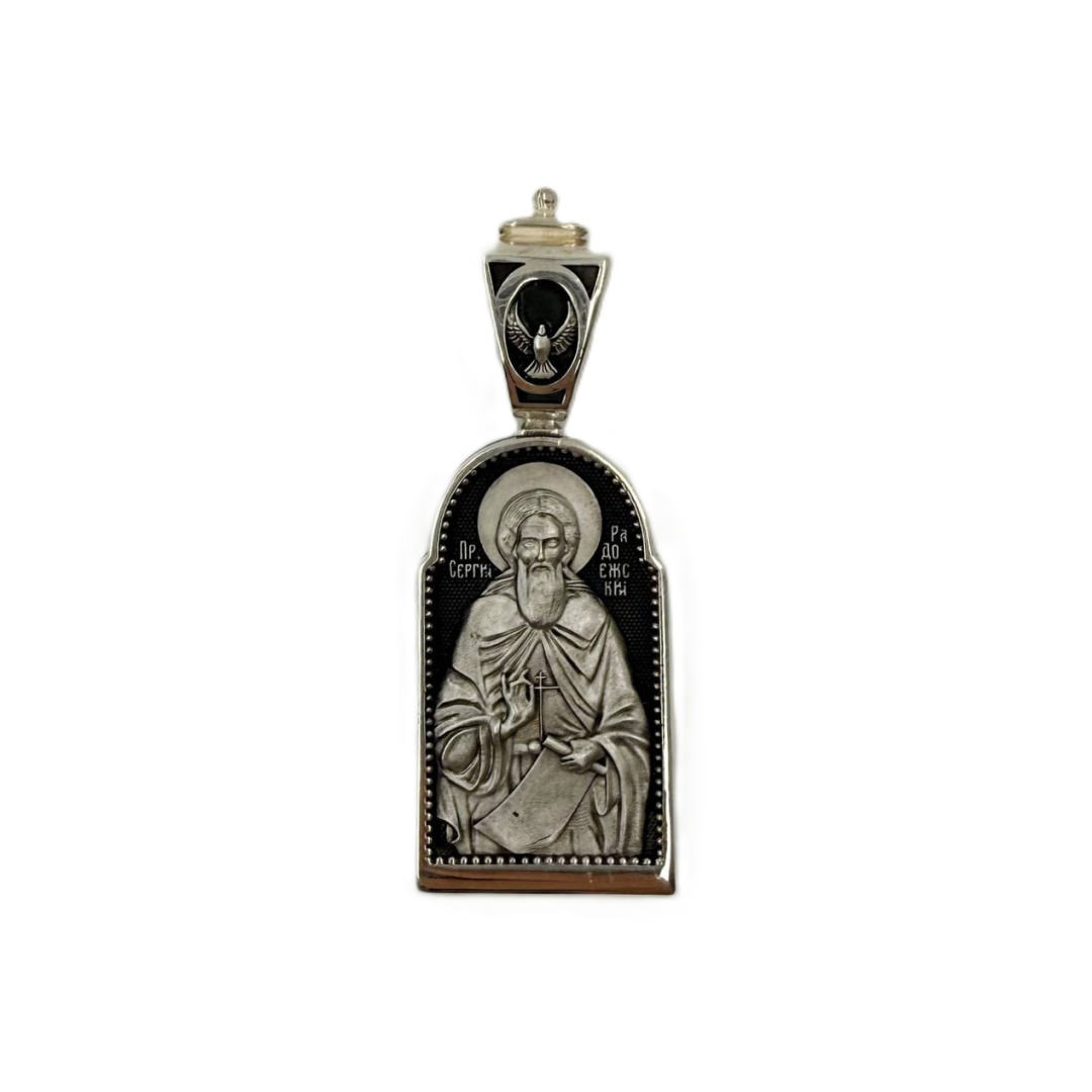 Подвеска с изображением преподобного Сергия Радонежского. В его Троице-Сергиеву Лавру приезжали за советом князья, он благословил Дмитрия Донского на Куликовскую битву. Но главным подвигом преподобного Сергия было служение Богу и людям, которым он помогал с деятельной и неизбывной любовью. Память святого совершается 18 (5) июля, 8 октября (25 сентября). На оборотной стороне молитва преподобному «И́же доброде́телей подви́жник, я́ко и́стинный во́ин Христа́ Бо́га, на стра́сти вельми́ подвиза́лся еси́ в жи́зни вре́менней, в пе́ниих, бде́ниих же и поще́ниих о́браз быв твои́м ученико́м; те́мже и всели́ся в тя Пресвяты́й Дух, Его́же де́йствием све́тло укра́шен еси́. Но я́ко име́я дерзнове́ние ко Святе́й Тро́ице, помина́й ста́до, е́же собра́л еси́, му́дре, и не забу́ди, я́коже обеща́лся еси́, посеща́я чад твои́х, Се́ргие преподо́бне, о́тче наш.».