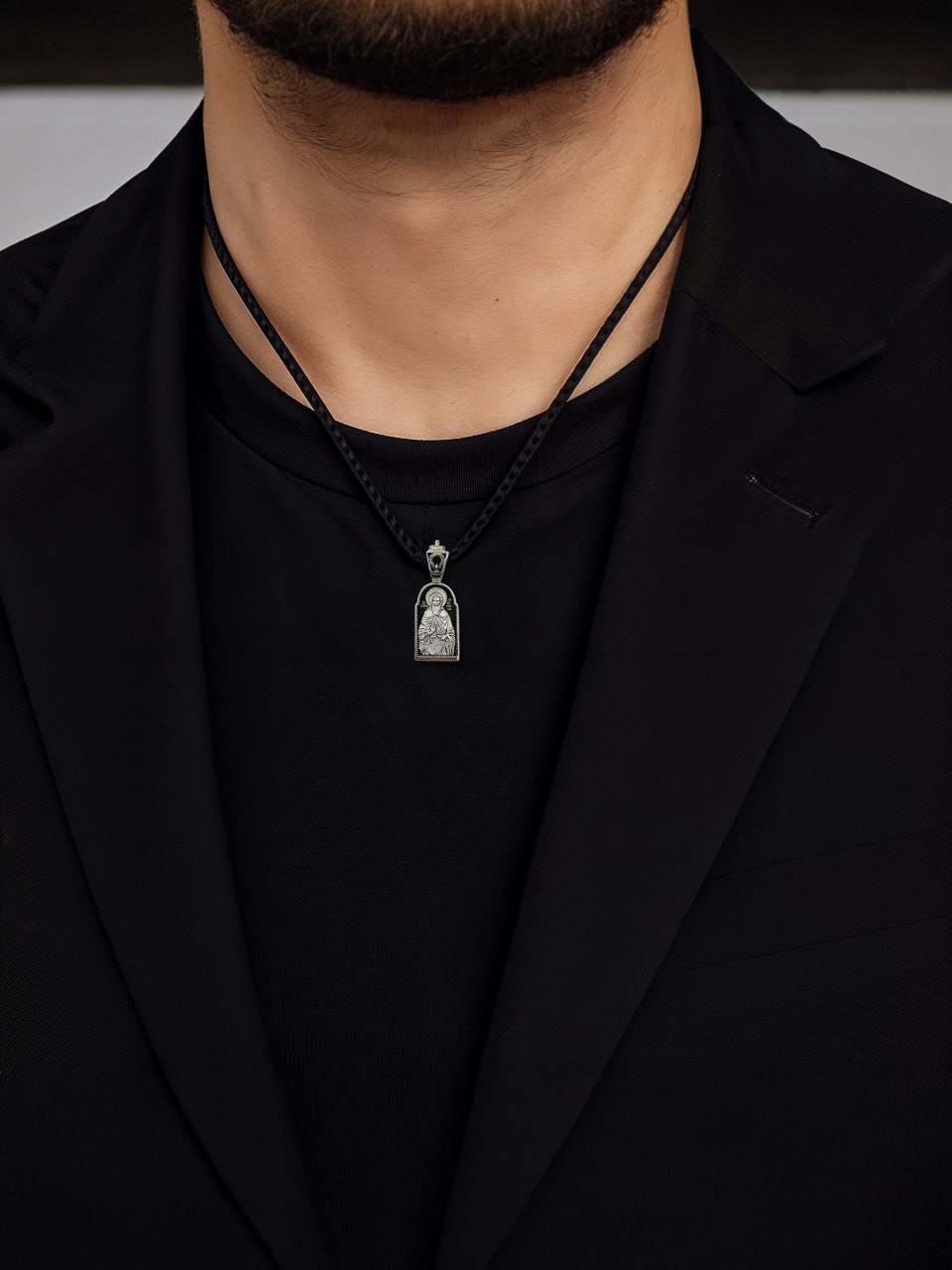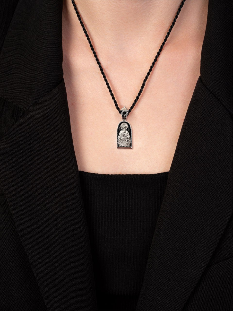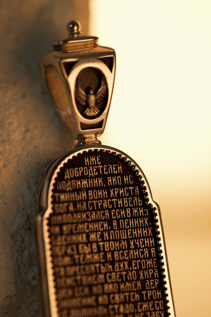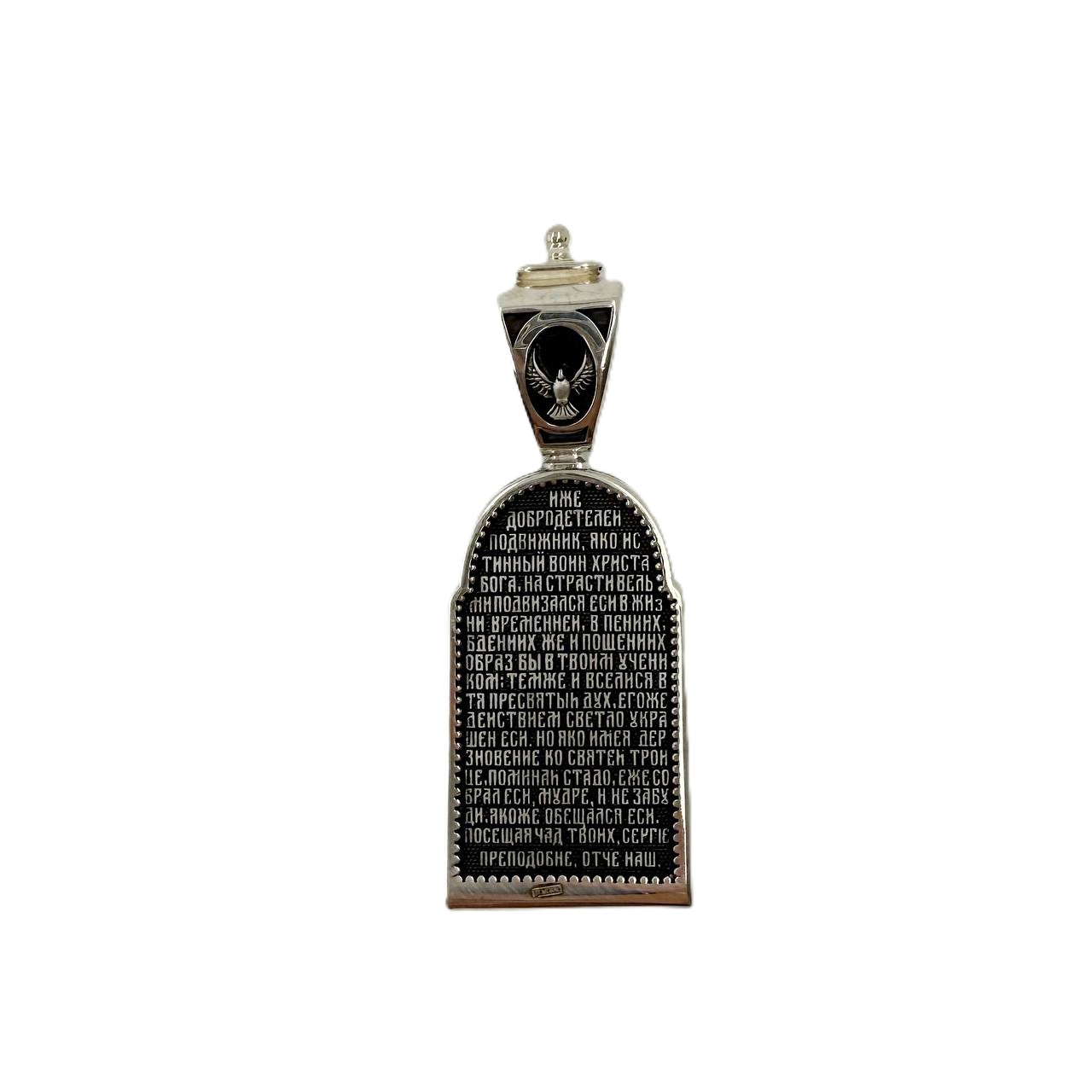 Подвеска с изображением преподобного Сергия Радонежского. В его Троице-Сергиеву Лавру приезжали за советом князья, он благословил Дмитрия Донского на Куликовскую битву. Но главным подвигом преподобного Сергия было служение Богу и людям, которым он помогал с деятельной и неизбывной любовью. Память святого совершается 18 (5) июля, 8 октября (25 сентября). На оборотной стороне молитва преподобному «И́же доброде́телей подви́жник, я́ко и́стинный во́ин Христа́ Бо́га, на стра́сти вельми́ подвиза́лся еси́ в жи́зни вре́менней, в пе́ниих, бде́ниих же и поще́ниих о́браз быв твои́м ученико́м; те́мже и всели́ся в тя Пресвяты́й Дух, Его́же де́йствием све́тло укра́шен еси́. Но я́ко име́я дерзнове́ние ко Святе́й Тро́ице, помина́й ста́до, е́же собра́л еси́, му́дре, и не забу́ди, я́коже обеща́лся еси́, посеща́я чад твои́х, Се́ргие преподо́бне, о́тче наш.».