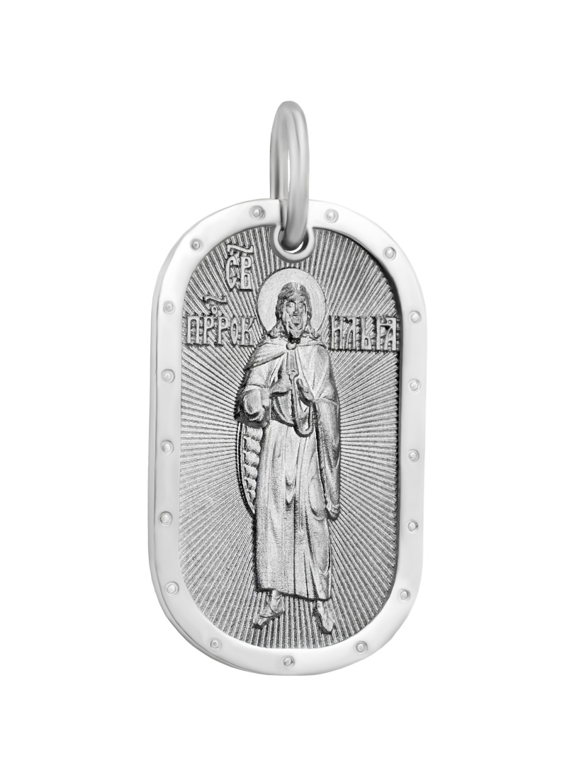 Медальон из серебра с изображением Пророка Илии. На оборотной стороне- молитва Отче Наш. Размер: высота 37 мм с ушком, ширина 18 мм. Состав: Серебро 925 пробы с родированным покрытием