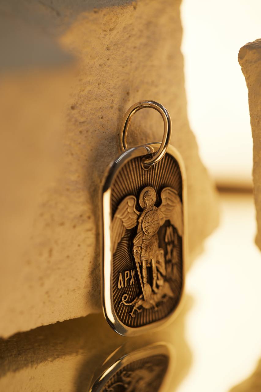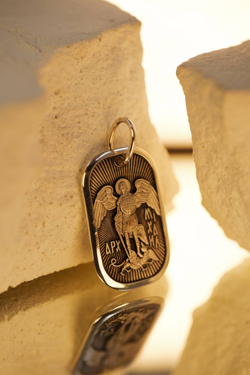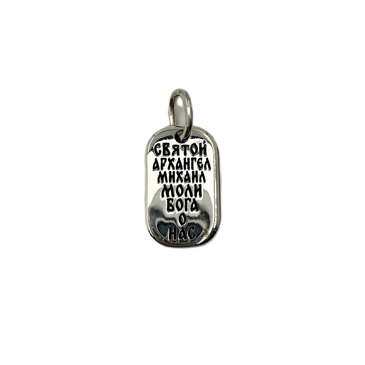 Подвеска медальон с изображением Архангела Михаила. Архистратиг Михаил является защитником веры и выступает против всякого зла. На оборотной стороне молитва ""Отче наш"". Соответствует канонам и изготовлено по благословению.