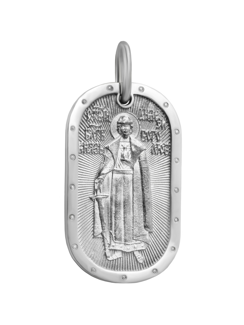 Медальон из серебра с изображением Св. Князя Андрея Боголюбского. На оборотной стороне- молитва Отче Наш. Размер: высота 37 мм с ушком, ширина 18 мм. Состав: Серебро 925 пробы с родированным покрытием
