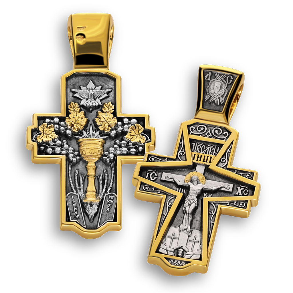 Изображение Распятия Христова обрамляет двойная рамка с изображением орнамента, который символизирует процветшее Древо Райское. В подножии Креста прах Первого человека Адама и два креста, посреди которых и был Распят Спаситель. (Лук. 23, 32 – 33) В оглавии лицевой стороны изображен пламенный Серафим. На оборотной стороне изображены скрижали Завета с десятью Заповедями. Скрижалью именуется и Пресвятая Богородица; она же — Почва невозделанная, из которой и произрос Хлеб Жизни – Христос (Ин. 6: 25). На это символически указывают изображенные колосья. В горизонтальной перекладине креста – обильно плодоносящая виноградная лоза. Ведь лозой именует себя Сам Христос (Ин.15:5). Именно вино и хлеб Иисус преподал на Тайной Вечери апостолам, указуя на них, как Своё на тело и кровь. В центре изображен потир (чаша) в который нисходит Солнце Правды — Христос, дабы пребывать и просвещать каждого, приступающего к святым Дарам. Над чашей возносится Дух Святой в виде голубя. Вся композиция указует на личность Христа и на центральное таинство христианской жизни — Евхаристию