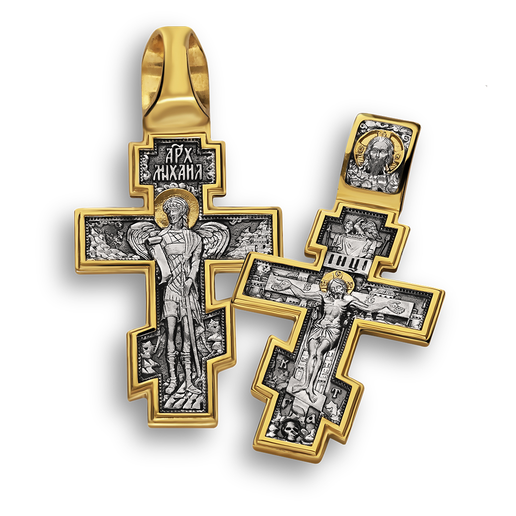 На лицевой стороне Иисус, над ним табличка «INЦI», что расшифровывается как «Иисус Назорей царь иудейский». Эту табличку прибили римские воины с насмешку над Господом. Чуть выше голубка — образ Духа Святого. Еще выше икона «Спас нерукотворный». У ног Христа буквы «к», «т» — копьё, трость — копьем пробили ребро Спасителя, на трости дали уксус, когда он просил воды. «г», «а» — голова Адама покоится по преданию на горе Голгофе, где и был распят Христос. Поэтому в подножии распятия и изображен череп.