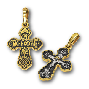 Крест четырехконечный с удлиненной нижней частью. В центре восьмиконечный крест, где изображён распятый Господь Иисус Христос. Распятие содержит в себе всю полноту силы, заключённой в крестном страдании Спасителя. На оборотной стороне молитва – прошение к Богу.