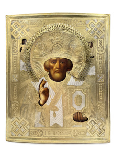 19 век, оклад латунь, гравировка, золочение, серебрение. Размер иконы 22*27 см