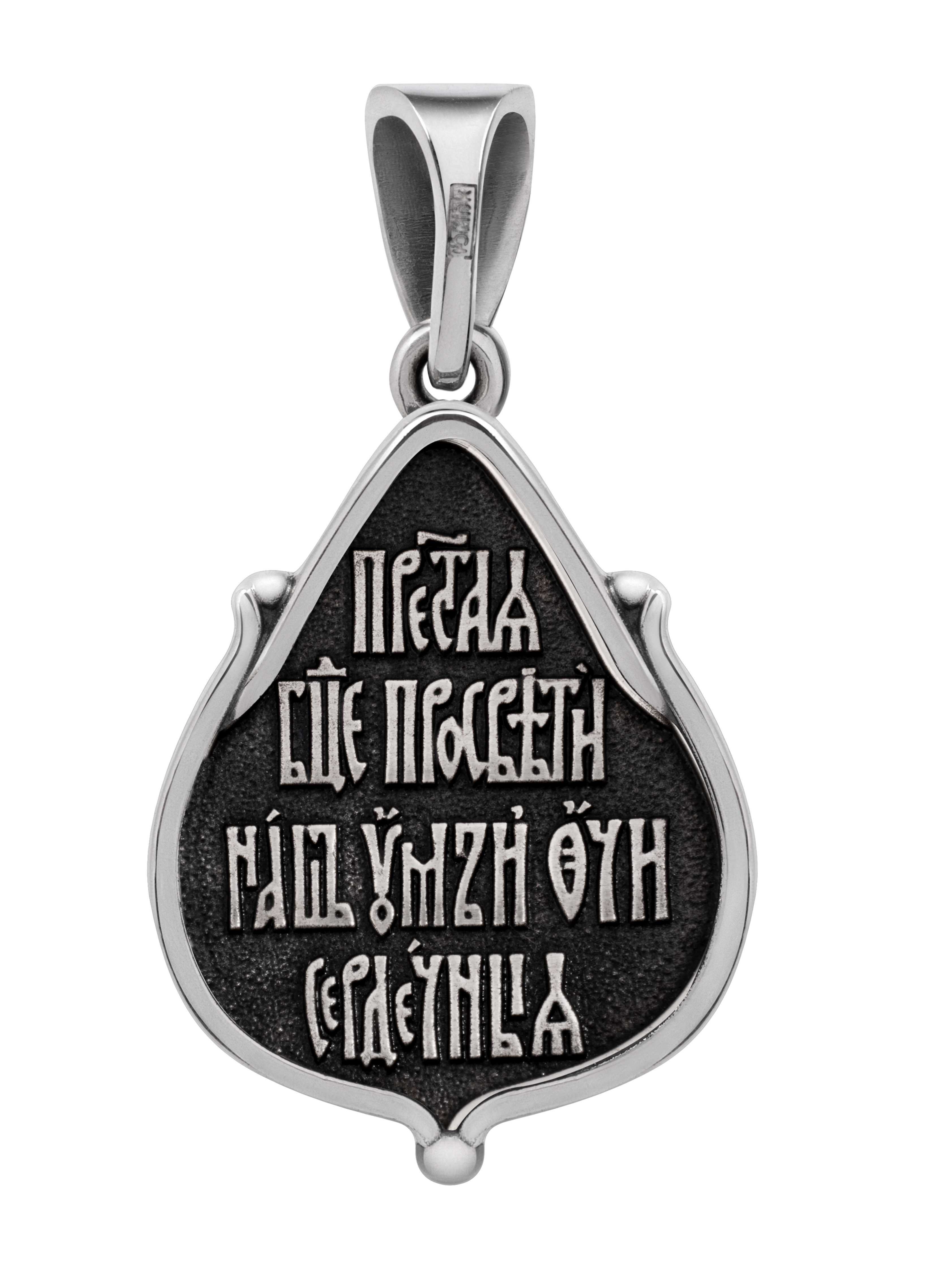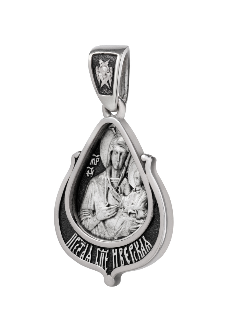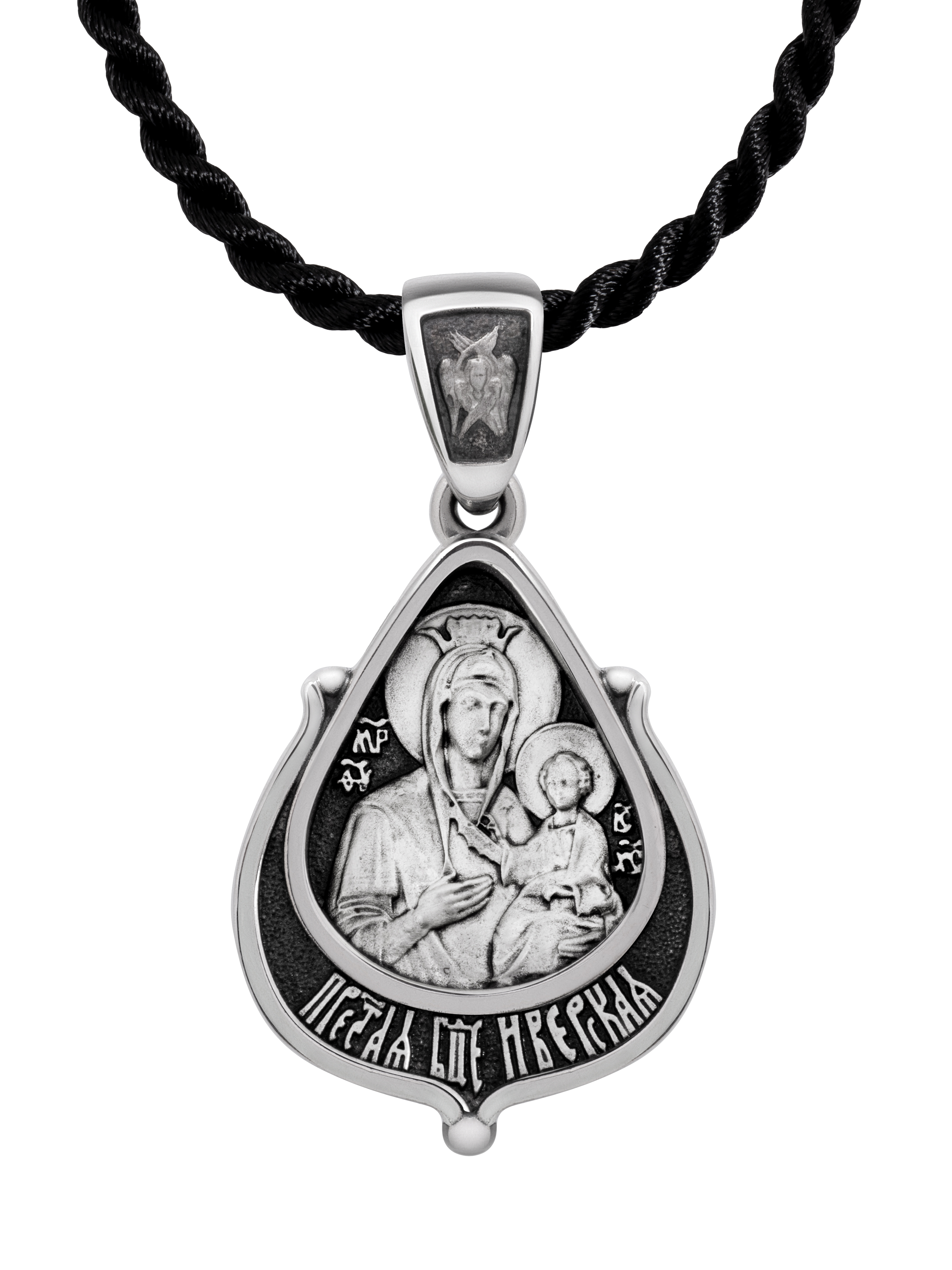 Подвеска в виде образа Иверской иконы Божией Матери — одна из самых любимых в народе. Богоматерь на Иверской иконе держит левой рукой Младенца, а правой указывает на Него как на Спасителя. Христос же одной рукой благославляет, а во второй держит свиток, символизирующий Евангелие. Расположение фигур такое, что Матерь Божья как бы создает защитное пространство для Богомладенца. Тем самым проиллюстрированы представления о Ней как о «вместилище Невместимого Бога». На обратной стороне молитва""Пресвятая Богородице просвети наш ум и очи сердечные"".