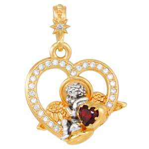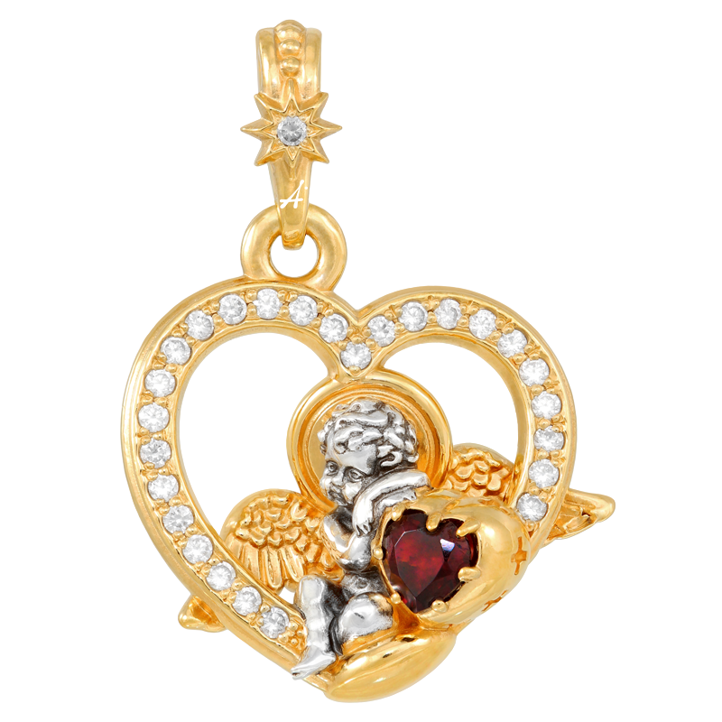 Ангелы прилетают к нам из мира совершенного света и красоты. Словно отблеск их Небесного сияния вокруг фигурки Ангела переливаются камни. Ангелочек обнимает сердечко из драгоценного граната. Оно символизирует сокровище Божественной любви, которую он принес в сердце человека.