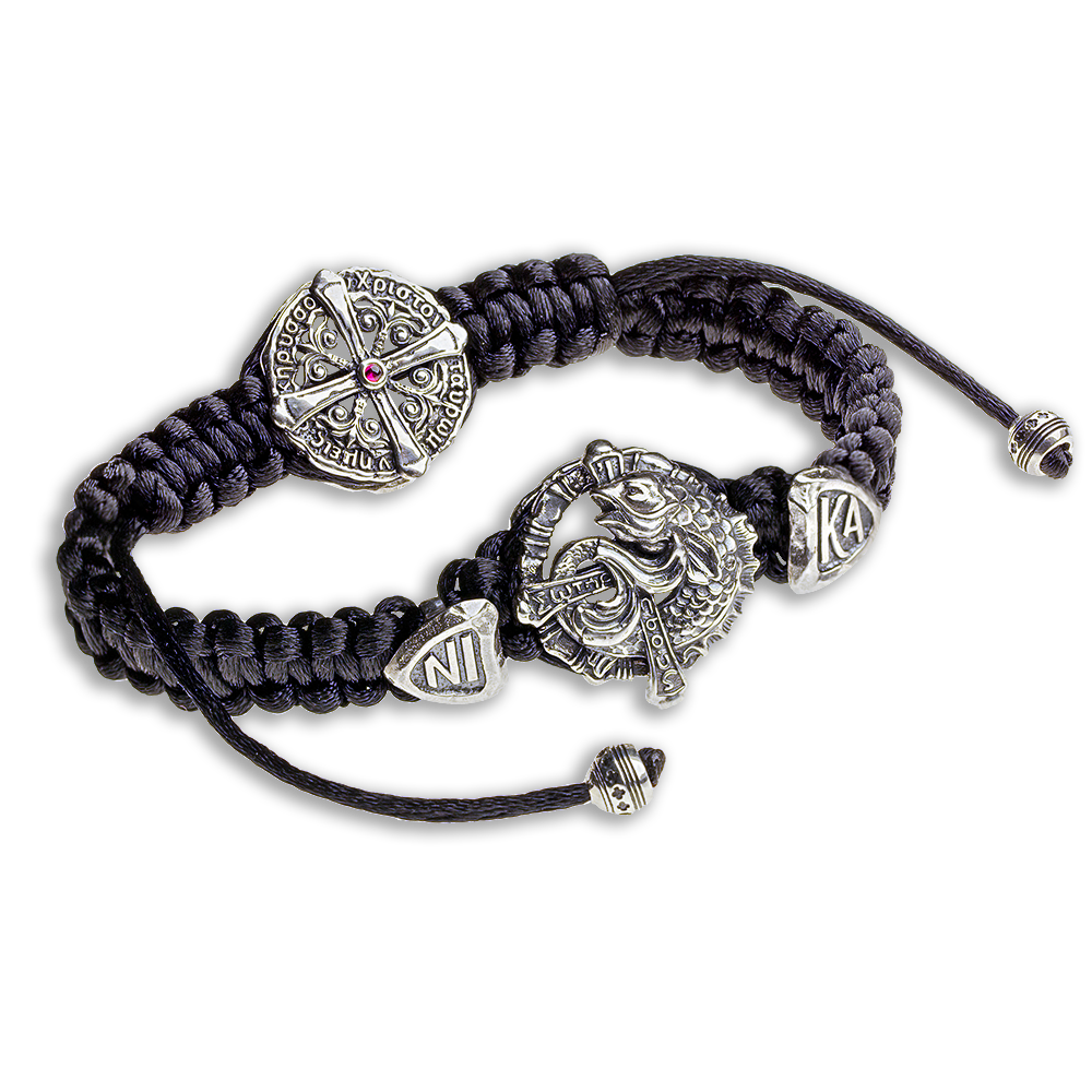 Браслет прообразует собой археологический артефакт. Надписи по-древнегречески, т.к. это язык распространения Христианства. На кресте та самая надпись: «Иисус Спасает» и главный христологический символ тех веков – рыба. Ассиметрия и сколы по краям отсылают к тому самому путешествию Павла в Рим, в которое и зародилась христианская община Помпеи. Если перевернуть оглавие браслета, можно прочесть первые слова Евангелия: «В начале было Слово, и Слово было у Бога, и Слово было Бог» (Ин.1:1). По краям Креста: «НИКА», т.е. победа Жизни над смертью. На нижней стороне браслета процветший крест с рубиновой каплей в центре, – символом Крови, которую Господь пролил за нас. Надпись по кругу: «Мы проповедуем Христа распятого» (1Кор.1:23) – именно этими словами ап. Павел благовестил о Любви Божьей и Силе Божьей, которая в немощи совершается.