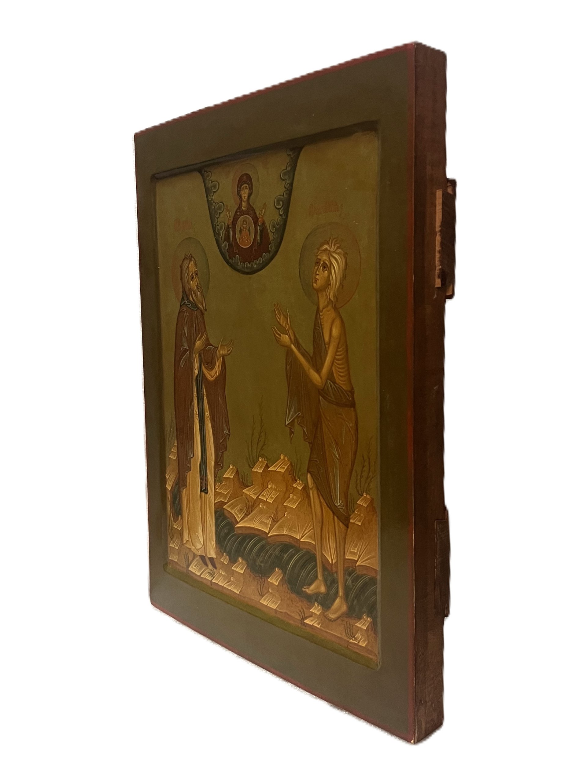 На этой иконе запечатлена одна из самых трогательных и поучительных встреч в истории христианской святости, встреча великого пустынника преподобного Зосимы с величайшей подвижницей, символом покаяния, преподобной Марией Египетской.