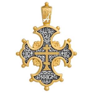 На лицевой стороне с двух сторон от восьмиконечного креста написано сокращенно святое имя Христа «ИС ХС», вверху «Царь Славы», внизу «НИКА», что значит «победил», потому что Крестом Господь победил смерть и открыл для людей врата Небесного Иерусалима. Но пройти через них смогут только праведники. Однако в душе всех христиан живет надежда на бесконечное милосердие Божие, поэтому на обороте креста написаны слова молитвы: «Господи, помилуй мя!».