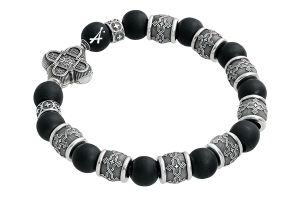 Браслет выполнен в древнерусском стиле и сочетает в себе бусины из серебра и черные деревянные. Серебряные бусины украшены традиционным русским орнаментом, в котором повторяется мотив ромба. Ромб — это древний символ плодородия и земли. На бусинах в ромбах заключены небольшие крестики, поэтому в такой интерпретации ромб — это образ земли, которую Иисус Христос спас Своим Крестом для вечной жизни.