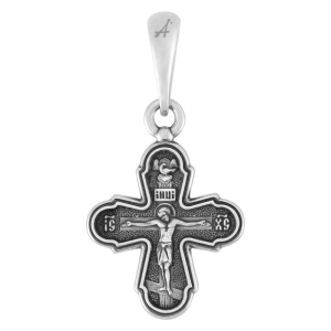 На лицевой стороне изображено Распятие Христово. В Православии Распятие — это жизнеутверждающий, победоносный символ. Тело Христа не провисает под своей тяжестью, а на лице Его мы не видим страдания и боли: напротив, Спаситель словно возвышается над всем миром, обнимая его распростертыми руками. Над головой Христа помещена табличка с надписью обвинения: «Иисус Назорей Царь Иудейский» (IНЦI), а слева и справа — инициалы Его имени: IC XC. Над Распятием изображен Престол Уготованный, на который Господь воссядет в конце времен во время Страшного Суда.