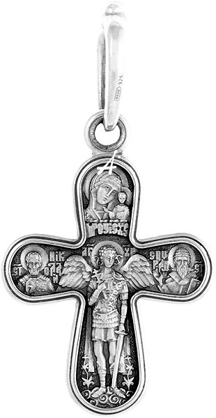 На обороте помещены образы защитников человека, помощников в жизни, заступников перед Богом. В центре находится икона Ангела Хранителя. Он ближе всех находится к человеку и у каждого свой. Ангел первым слышит наши молитвы, воздыхания, и поднимает свой меч в случае нападения бесов. Вверху помещен образ Казанской иконы Божией Матери, которая как щит защищает с XVI века Русскую землю и каждого верующего. Справа и слева — иконы любимых святых чудотворцев, помощников и заступников, целителей и покровителей православных. Это святитель Николай Чудотворец и святитель Спиридон Тримифунтский.