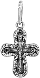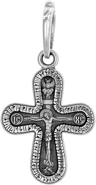 На лицевой стороне креста изображено Распятие Господа Иисуса Христа. Его тонкая, словно летящая фигура, окружена ангельским хвалебным гимном Его Матери, Пресвятой Богородицы. Только благодаря Ей, Ее святости и любви к Богу, единственной без греха, Бог смог соединиться с человеческой природой и прийти в мир для искупления его Своею кровью. «Богоро́дице Де́во, ра́дуйся, благода́тная Мари́е, Госпо́дь с Тобо́ю, Благослове́нна Ты в жена́х и благослове́н Плод чре́ва Твоего́, я́ко Спа́са родила́ еси́ душ на́ших». Эту молитву читают для укрепления веры, в горе и печали, в унынии, в долгой и трудной дороге, для изгнания злых духов.