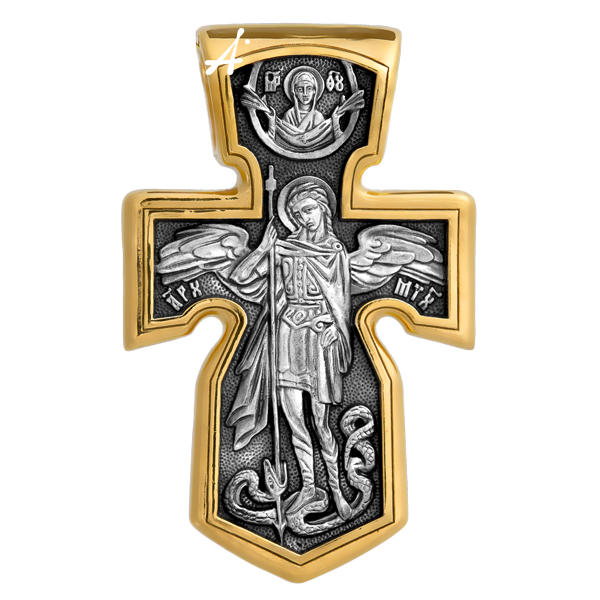 На оборотной стороне креста помещен Архангел Михаил, самый могущественный из ангелов. Это он низверг дьявола и встал во главе ангелов для борьбы с бесовскими силами. Его имя означает «Кто яко Бог?», так как он самый могучий и грозный враг зла. Древнерусские князья и воины стремились обрести покровительство Небесного Воеводы и нередко украшали свои шлемы его крылатой фигурой. На Руси также верили, что Архангел Михаил, как непримиримый враг дьявола, защищает и души умерших от бесовских нападений, провожая их на Небеса. Поэтому ему часто посвящались кладбищенские церкви.
