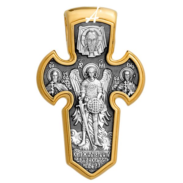 С двух сторон от Архистратига Михаила стоят еще два воина дружины Христовой: великомученик Феодор Тирон, пострадавший в 306 году в г. Анасии (пам. 2 марта), и мученик Иоанн Воин, погибший от рук палачей при Юлиане Отступнике в IV веке (пам. 12 августа). Внизу, на символическом острие клинка, написана молитва Кресту: «Кресте Живоносный, ты ми буди крепость и победа». Это молитва воина, восставшего против зла, вооруженного любовью к ближнему, верой в Бога и надеждой на Его помощь.