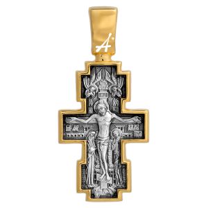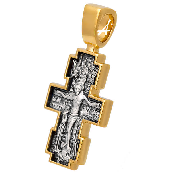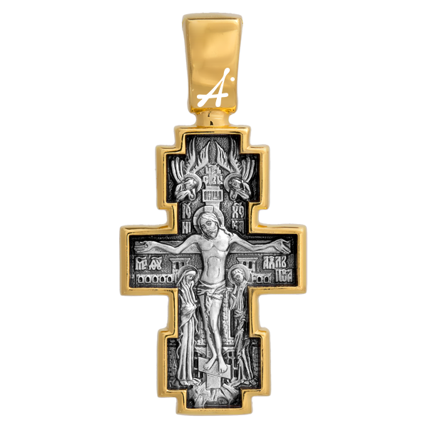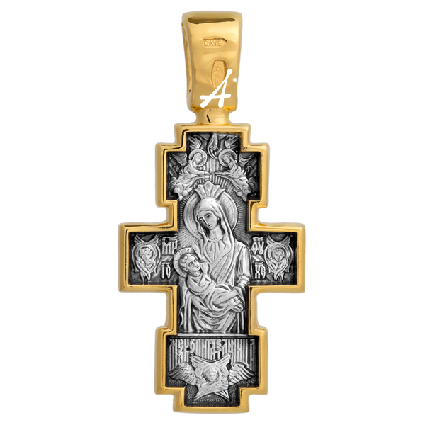 На лицевой стороне традиционного для православия восьмиконечного креста помещена икона Распятия Господа Иисуса Христа со скорбно предстоящими Богоматерью и апостолом Иоанном Богословом. Вверху летят плачущие ангелы. Весь мир, земной и небесный, ужаснулся, увидев мучения своего Творца. Но больше всех страдала Пресвятая Богородица, Которая плотью родила Младенца Христа и питала Его Своим молоком. И тем величественнее подвиг любви Пресвятой Девы Марии, Которая, приняв такие страдания, не отвернулась от распявших Ее любимого Сына людей, а стала им милосердной Матерью и Падельницей всяческих благ. Поэтому каждый христианин в своем сердце всегда воспевает Пречистую Преблагословенную Славную Владычицу нашу Богородицу, «Честнейшую Херувим и Славнейшую без сравнения Серафим».