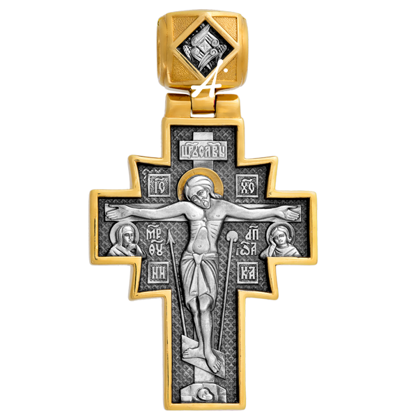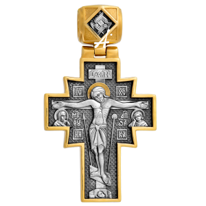 На лицевой стороне креста помещен величественный образ Распятого Спасителя Иисуса Христа. Он простирает могучие руки, словно обнимая мир, на который взирает с Креста с состраданием и любовью. В православном Распятии всегда есть образ грядущего воскресения Господа. Страдания Христа не были напрасны: через них каждый человек получил возможность спасения. Господь воскрес, и всякий человек, уповающий на Него, тоже воскреснет для вечной жизни в Небесном Иерусалиме. Бог отвечает тем, кто верует и молится, и в этой, земной жизни. Чаще всего Господь подает помощь через других людей. Этих своих посланников, спасателей, Он поддерживает особо, как помощников и соработников. Об этом – древняя молитва на обороте креста.