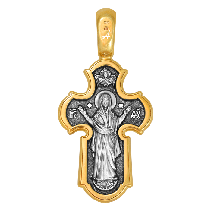 Все пространство оборота креста занимает одна из самых древних и почитаемых святынь России — икона Божией Матери «Нерушимая Стена». Ее первообраз был выполнен в технике мозаики на стене алтарной апсиды Софийского собора в Киеве, построенного еще в XI веке. Это величественное изображение, представляющее Божию Матерь в позе Оранта, с воздетыми в молении руками. В течение долгих веков образ не имел списков. Много бед и разрушений от разных врагов за это время претерпел Киев и его главный храм. Но святая икона оставалась невредимой, защищая всех, прибегающих к ней за помощью. За чудесную несокрушимость икона получила название «Нерушимая Стена» и так полюбилась людям, что с нее стали делать списки, многие из которых сами прославились чудотворениями. Особенно почитается эта икона как помощница в тяжелых жизненных ситуациях, как защитница от врагов и спасительница в смертельной опасности. Ее память совершается 31 мая (12 июня) и в Неделю всех святых.