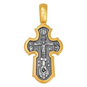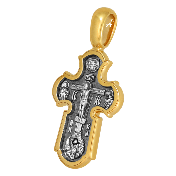 Лицевая сторона креста по канону посвящена Господу Иисусу Христу. Чаще всего на нательных крестах изображается Распятие, которое символизирует победу над грехом и смертью. Своими страданиями Господь искупил грехи человечества: умерев и сошествовав во ад, Он победил дьявола, освободил души праведников от вечной смерти и открыл им Небесные врата рая. Жертва Христа сделала возможным спасение для каждого человека. Поэтому на православных крестах Господь изображается не страдающим, а словно возносящимся и обнимающим весь мир. Он — Спаситель человечества, поправший смертию смерть и призывающий к Себе «все концы земли» (Ис. 45: 22). С двух сторон от Христа изображаются Его Мать, Пресвятая Богородица, и любимый ученик, апостол Иоанн Богослов. Они стояли у Креста неотлучно до самого конца, пока Господь не предал дух Свой Небесному Отцу. Позади — Иерусалимская стена. На иконах она обозначает место казни и символизирует Небесный Иерусалим, путь в который открылся для человечества через Голгофу.