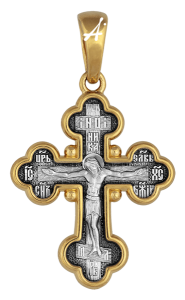 Нательные кресты прямой формы с трехлепестковым завершением перекладин были широко распространены на Руси на протяжении всего средневековья. Они символизировали просвещение светом христианского учения, веры в Пресвятую Троицу, всех концов земли. Лицевую сторону таких крестов всегда украшал образ Распятия. Помещен он и на наш крест. Основной четырехконечный крест пересекается дополнительно двумя короткими перекладинами. В верхней части помещена табличка с надписью обвинения против Иисуса Христа: «Иисус Назорей Царь Иудейский» (IНЦI), а также слово «НИКА», что значит «победа». Внизу изображено наклоненное подножие. Оно символизирует весы, на чаши которых на Страшном Суде будут полагаться добрые и злые дела людей. Слева и справа от креста написаны именования Спасителя — IC XC, «Сын Божий» и «Царь Славы». В основании креста написана аббревиатура МЛРБ — «Место Лобное Рай Бысть».