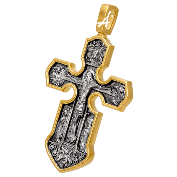 На лицевой стороне рядом с Распятым Спасителем стоят святые мученики Киприан и Иустина. Священномученик Киприан до крещения был знаменитым колдуном, служителем сатаны и его любимцем. Однажды сатана даже посадил его на свой трон, надел корону и пообещал после смерти сделать своим князем. Жестокость и могущество Киприана приводили людей в ужас, его боялись и поклонялись, как божеству. Но сатана, который дал колдуну силу насылать болезни и смерть, вызывать бури, иссушать землю, оказался бессилен перед кроткой христианской девицей Иустиной, которая постом, молитвой и крестным знамением поставила перед темной силой непреодолимую преграду. И случилось чудо – великий колдун уверовал во Христа, покаялся в грехах и вступил в страшный и мучительный бой с сатаной. За этот подвиг Господь даровал святому благодать помогать людям в борьбе с дьяволом. Поэтому в минуты искушений и опасности Церковь советует призывать имена святых Киприана и Иустины. Святой Киприан впоследствии стал священником и вместе со святой Иустиной в 304 году принял мученическую смерть во времена гонений на Церковь при императоре Диоклетиане.