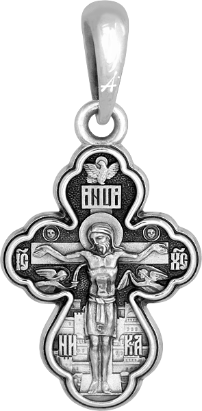 Крест — это символ победы над смертью, и Распятие — победоносный, торжественный образ. Это отражается в надписи «НИКА» над крестом, что в переводе с греческого означает «победа». Торжественность образа подчеркивается фигурой Христа: тело не провисает на перекладине под своей тяжестью, а словно парит над всем миром. Слева и справа помещены инициалы имени Спасителя IC XC, а над головой Христа висит табличка IНЦI, означающая обвинение против Него: «Иисус Назорей Царь Иудейский». Наклоненное книзу подножие символизирует весы, на чаши которых на Страшном Суде будут полагаться добрые и злые дела людей.