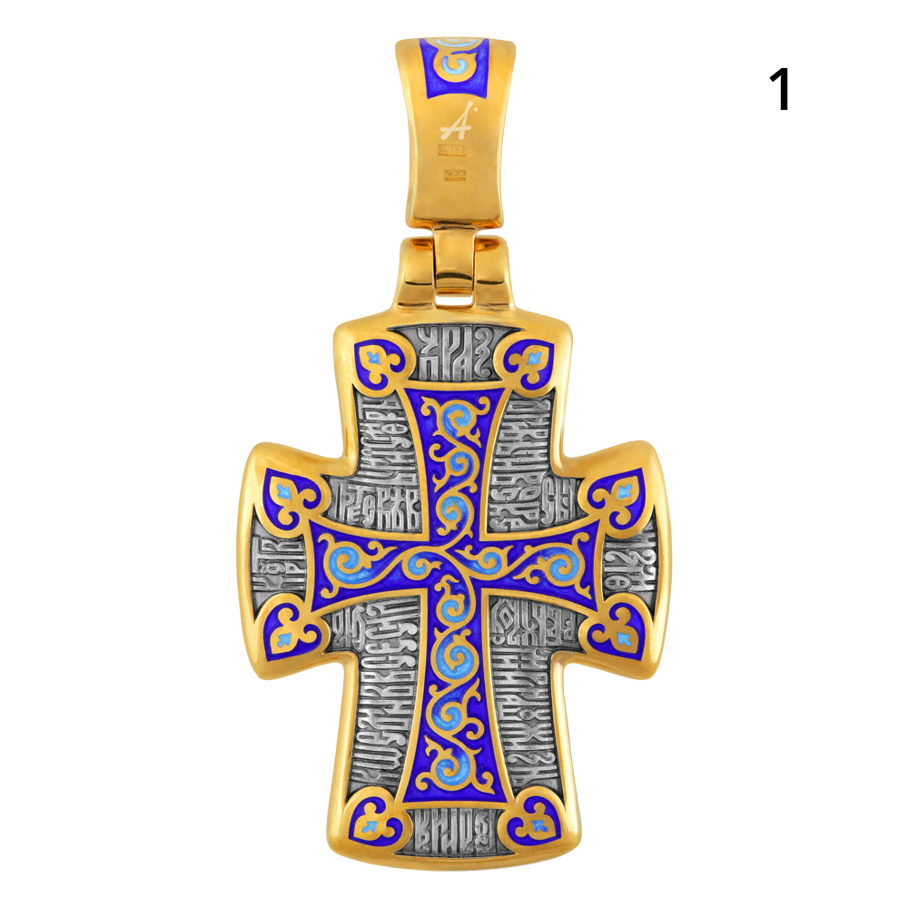 Внутренняя строгая форма креста, очерчивающая рельефное Распятие, подчеркнута внешним, более свободным объемом, украшенным эмалью с золотым нитевидным орнаментом. Эта простая четырехконечная форма имеет многочисленные духовные смыслы. Ее устремленная ввысь вертикаль означает справедливость и непреложность Божественных заповедей, прямоту Божией правды и истины, не допускающей никаких нарушений. Эта прямота пересекается поперечной перекладиной, означающей любовь и милость Божию к грешным людям. Ради этой любви и был принесен в жертву Господь, взявший на Себя грехи человечества.