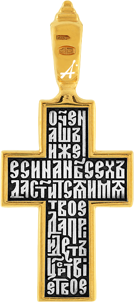 Текст молитвы на лицевой стороне изображен в традициях древнерусских ювелирных изделий, образуя на кресте буквенный орнамент. Текст полностью огибает Распятие по краю. Это молитва из Канона Честному Животворящему Кресту: «Кресте Ты ми сила буди, крепость и держава, избавитель и предратник на борющыя мя, щит и хранитель, победа и утверждение мое, присно соблюдающи мя и покрывающи». Ее можно читать в любых бедах и опасностях.