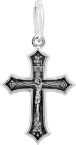 Строгий лаконичный крест традиционной четырехконечной формы. На лицевой стороне изображено Распятие. В православной традиции не принято изображать физические страдания Христа на Кресте: Распятие — торжественный, жизнеутверждающий образ спасения всего человечества. Поэтому Спаситель словно парит над миром на кресте, обнимая его распростертыми руками.