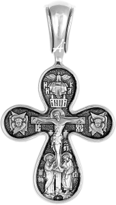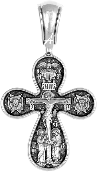 Словно лепестки, раскрываются грани этого четырехконечного креста. Такая форма традиционна и существует со времен древней Византии. На лицевой стороне креста изображено Распятие — победоносный, величественный образ христианства. Своей искупительной жертвой Господь сделал страшное орудие казни орудием победы над грехом и смертью. Страдания и смерть Христа открыли двери спасения каждому человеку, сделали Рай доступным. Поэтому в православной традиции Спаситель никогда не изображается страдающим, а Его тело не провисает под своей тяжестью. Христос словно парит над всем миром, обнимая его распростертыми руками.