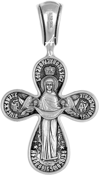 Оборотная сторона креста по традиции посвящена Богоматери. Здесь Она изображена молящейся за мир и простирающей над ним Свой Покров, который несут ангелы.