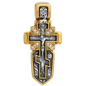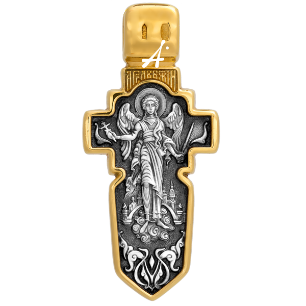 На обороте креста находится образ Ангела Хранителя. Его легкая фигура парит на облаках у стен Небесного Иерусалима. Это символическое изображение Ангела, который, вооружившись крестом и духовным мечом, покидает свое Небесное Отечество, чтобы вести битву со злом за человеческие души здесь, на земле. Ангелов бесчисленное множество, и все они составляют стройную Небесную иерархию. Ангелы Хранители ниже остальных чинов, ближе всех к людям и служат защитниками каждого из нас.