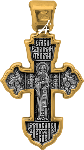 Оборот креста посвящен величайшему святому России, преподобному Сергию Радонежскому, который прославился как великий молитвенник и чудотворец. Святой начал свой путь к Богу отшельником недалеко от Москвы в дремучих Радонежских лесах, где основал монастырь, ставший духовным центром Руси. По молитве преподобного Сергия происходили великие чудеса и исцеления, а основанная им Троице-Сергиева Лавра процветает по сей день.