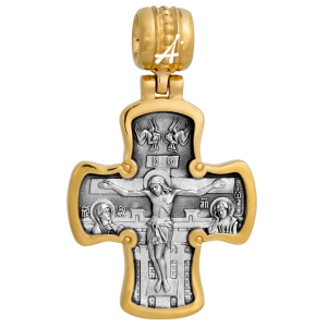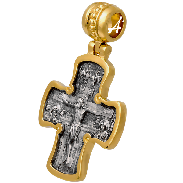 Лицевая сторона креста по канону посвящена Господу Иисусу Христу. Чаще всего на нательных крестах изображается Распятие, которое символизирует победу над грехом и смертью. Своими страданиями Господь искупил грехи человечества: умерев и сошествовав во ад, Он победил дьявола, освободил души праведников от вечной смерти и открыл им Небесные врата рая. Жертва Христа сделала возможным спасение для каждого человека. Поэтому на православных крестах Господь изображается не страдающим, а словно возносящимся и обнимающим весь мир. Он – Спаситель человечества, поправший смертию смерть и призывающий к Себе «все концы земли» (Ис. 45, 22). С двух сторон от Христа изображаются Его Мать, Пресвятая Богородица, и любимый ученик, апостол Иоанн Богослов. Они стояли у Креста неотлучно до самого конца, пока Господь не предал дух Свой Небесному Отцу. Позади — Иерусалимская стена. На иконах она обозначает место казни и символизирует Небесный Иерусалим, путь в который открылся для человечества через Голгофу.