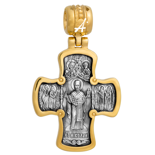 На обороте креста помещена икона самого почитаемого на Руси святого – Николая Чудотворца (втор. пол. III в.). Он был епископом в городе Миры римской провинции Ликия в Малой Азии и прославился великими чудесами и делами милосердия, которые продолжает творить и за гробом. Св. Николая молят о заступничестве нуждающиеся, терпящие бедствие, невинно осужденные. Он помогает всем обращающимся к нему с верой и молитвой: учащимся, путешествующим, морякам и торговцам, исцеляет болящих, умиротворяет враждующих, находит пропавших и даже воскрешает умерших.
