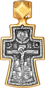 Слева и справа от Креста помещены солнце и луна. Это обозначение всего мира, который ужаснулся мучениям Иисуса Христа. Согласно Евангелию, во время казни Христа «тьма была по всей земле» (Мф. 27: 45). Также это символическое изображение тьмы греховной, в которой покоился мир, и света, который принес в него Спаситель. Выше помещен образ Спаса Нерукотворного. По преданию, Христос Сам чудесно явил этот образ на полотенце (убрусе), отерев им лицо. «Царь Славы Сын Божий» — гласит подпись под ним. Вокруг Распятия по краю креста помещены первые строки молитвы «Да воскреснет Бог». Ее читают в бесовских напастях, искушениях, в сложных жизненных ситуациях. Она почитается как самая действенная оградительная молитва. Вверху, на ухе креста, написана еще одна оградительная молитва: «Господи, Иисусе Христе, Сыне Божий, помилуй нас». Молитва вписана в ромб с крестом посередине. Ромб — традиционный символ земли, поэтому ромбом с крестом и молитвой — это образ земли, которую Иисус Христос спас Своим Крестом для вечной жизни.