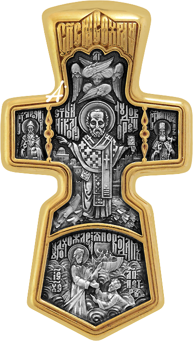 Образ Николая Чудотворца в иконографии «Никола Зарайский» помещен и на оборотной стороне креста. С двух сторон от свт. Николая помещены русские святые, покровители флота и мореплавателей свт. Митрофан Воронежский (1623–1703) и прп. Арсений Коневецкий († 1447).