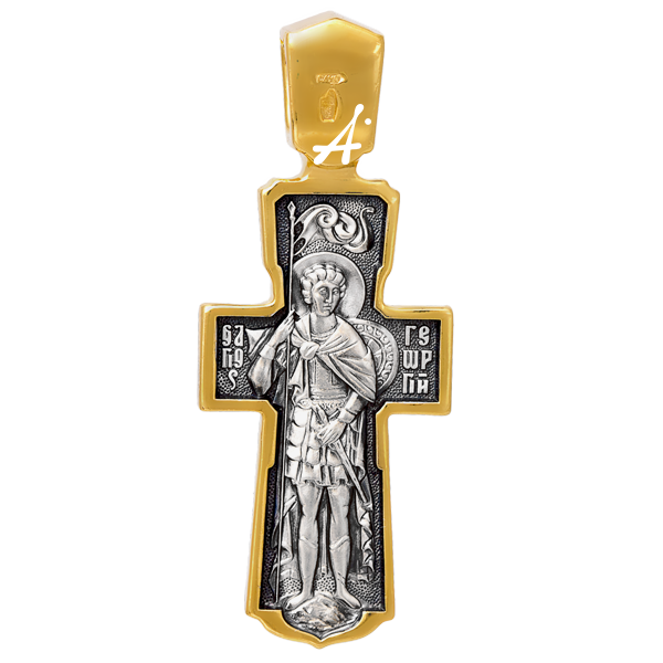 Оборотную сторону креста украшает величественный образ великомученика Георгия, одного из самых почитаемых в христианстве святых воинов. На Руси больше всего был распространен и известен образ Георгия на коне, поражающего змея – именно в такой иконографии он называется Победоносцем. На этом кресте святой представлен иначе, стоящим в полный рост, в воинских доспехах. В правой руке он держит флаг, развевающийся на длинном древке, а в левой сжимает меч. На плечах Георгия повязан плащ, а за спиной круглый щит. Это – образ воина-победителя. Однако главная победа святого Георгия состояла не в воинских успехах в императорской армии, а в победе над злом. Храбрый святой защитник, не убоявшийся мучителей и добровольно принявший смерть за Христа, стал олицетворением борьбы добра со злом, торжества Божьей правды над злодейством и несправедливостью. Его мученическая смерть за веру стала настоящим подвигом. Несмотря на знатное происхождение, на офицерскую должность в армии римского императора, богатство и успех, святой воин не побоялся отказаться от всего этого и выступил в защиту преследуемых по всей империи христиан. Господь даровал Георгию мученический венец и чудотворную силу для помощи людям. Великомученик почитается как великий чудотворец, покровитель воинов и помощник в разных невзгодах и опасностях.